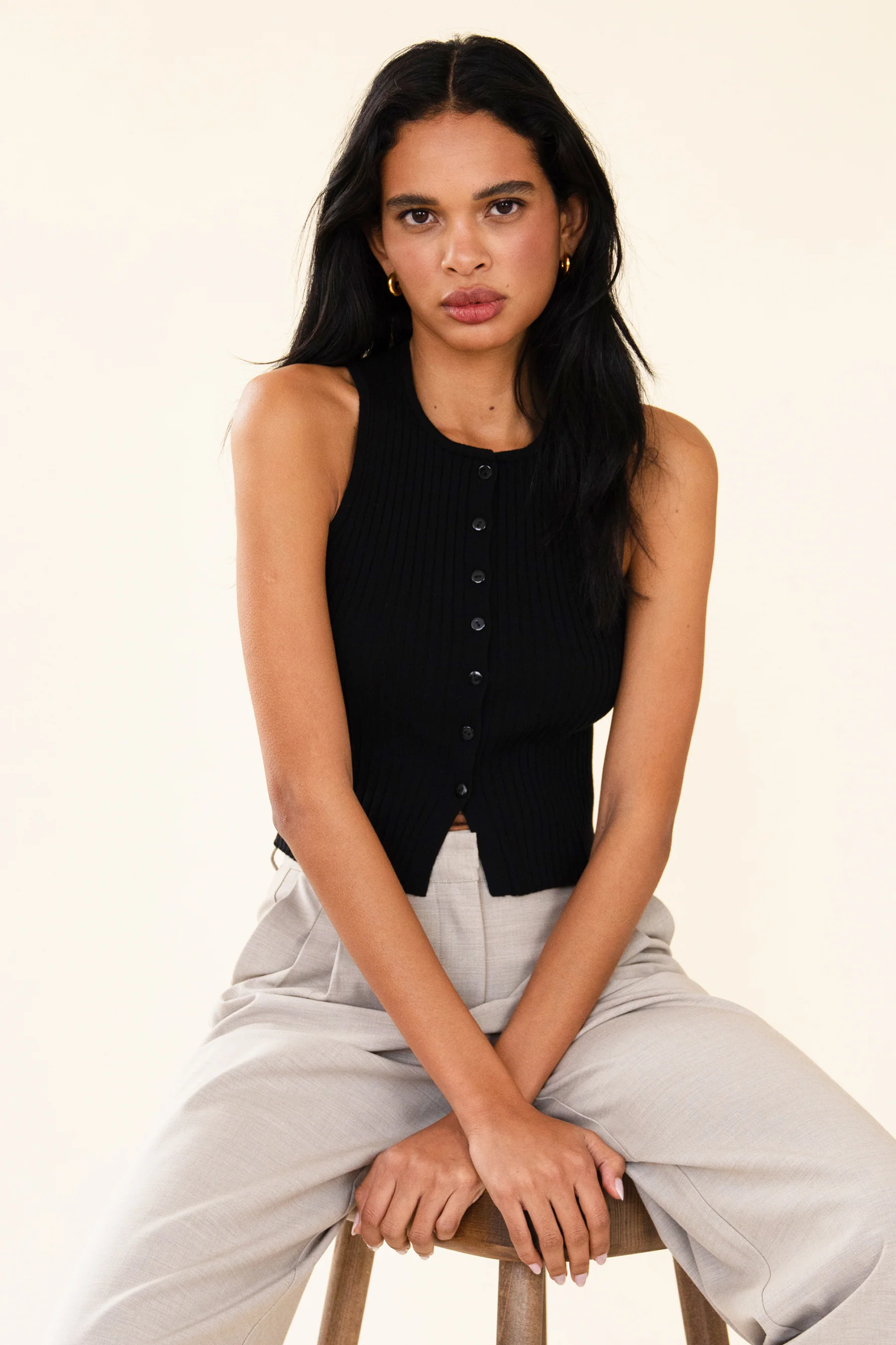 The Brea is a knitted button front vest, an elevated basic to style with denim or skirts for understated style. Model wears size XS and is 5'10.
