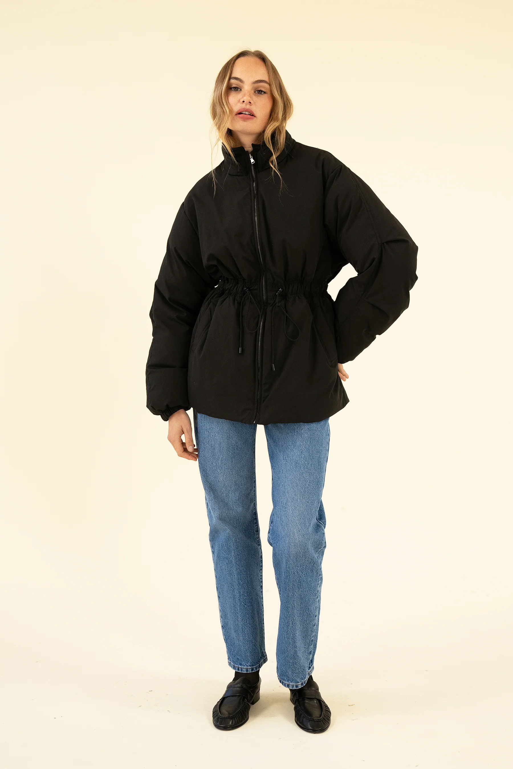 An ode to the 80's, our new version of Cadence is made from Recycled Polyester and is thigh length. She cinches at the waist with an adjustable cord, is so warm and comfortable and has a double ended zip opening.