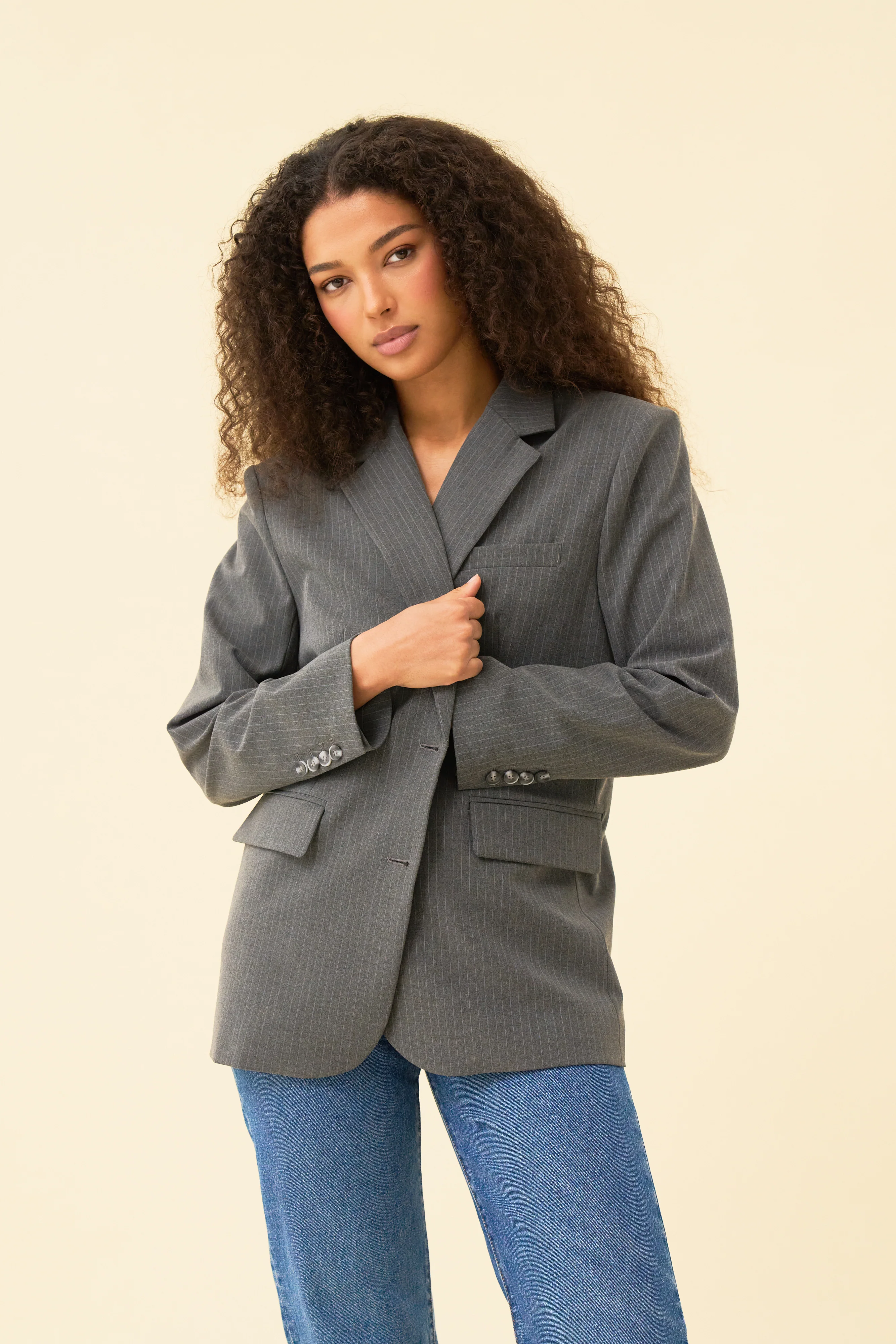 The Julia is a wardrobe staple. A perfect jacket, she has an oversized fit and can be grabbed on the go to layer over any look. She has shoulder pads to hold her shape, she's a must have.