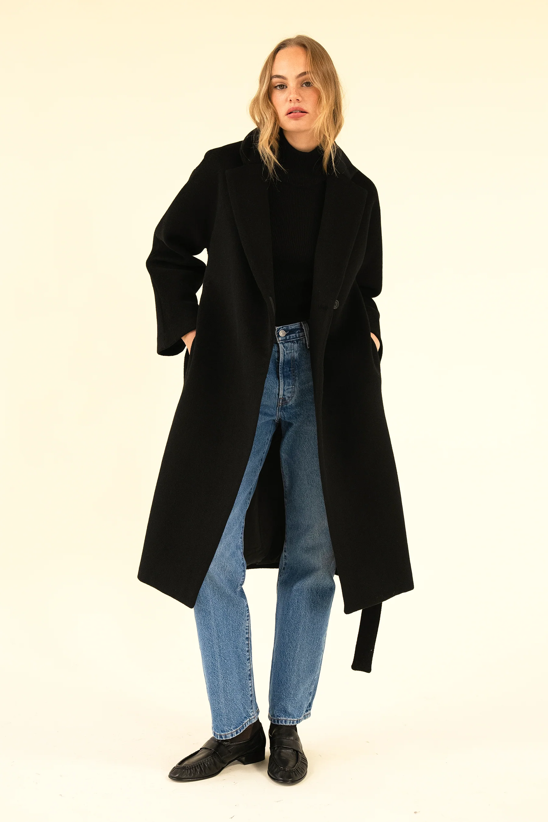 The Mabe is the perfect oversized, full length classic wool coat. Layer her over anything this winter to keep you super warm. She's made from 100% heavy wool. Model wears size S and is 5'9 / 175cm.